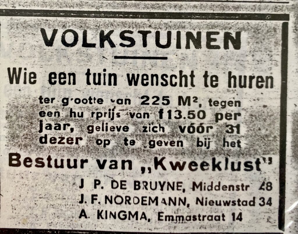Toen rees de gedachte der volkstuinen, die geen fundamentele betekenis van economische of sociale hervorming had, maar de mogelijkheid opende om op ruime schaal voor stadsgezinnen geluk, genot, gezondheid en zuiver lucht, verheuging in het leven met de natuur te brengen.