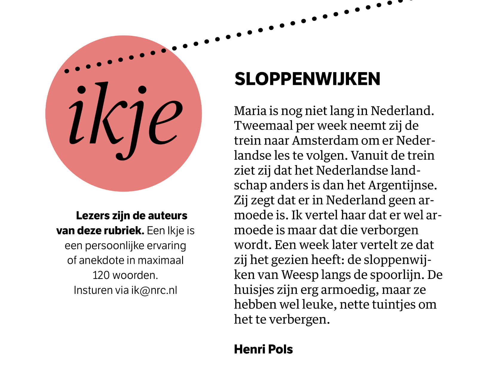 Wie met de trein tussen Amersfoort of Almere en Amsterdam reist, komt langs Kweeklust. Zoals ook in dit ‘Ikje’ van NRC van 23 januari 2023.